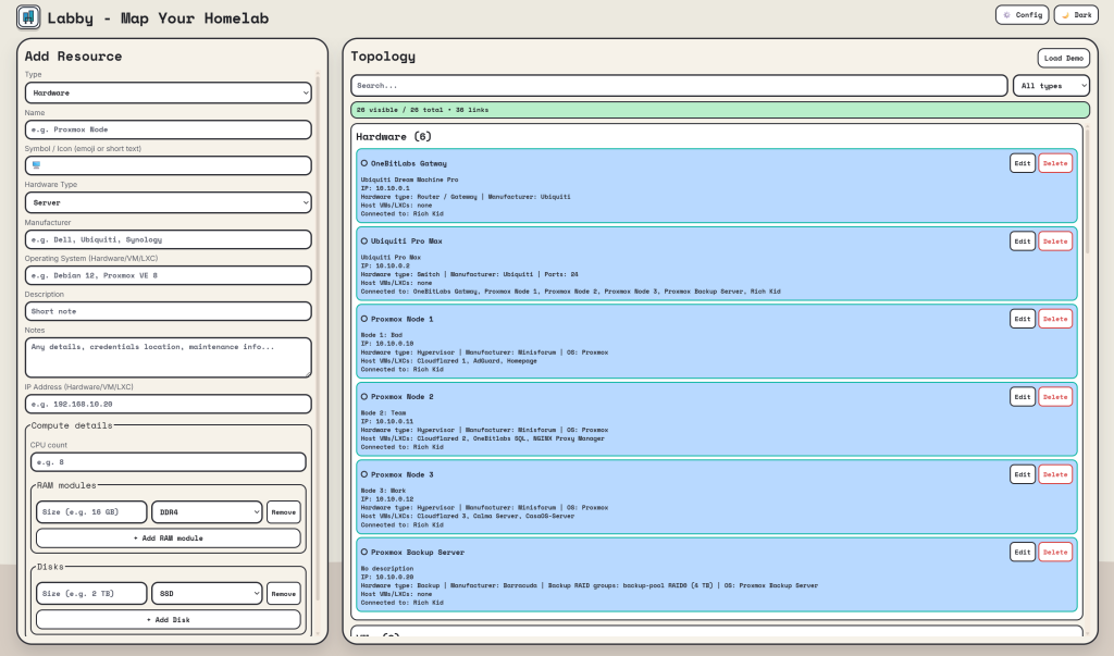 Labby is a homelab documentation web app. You can either deploy it yourself via Docker or use the hosted version at www.my-labby.com.